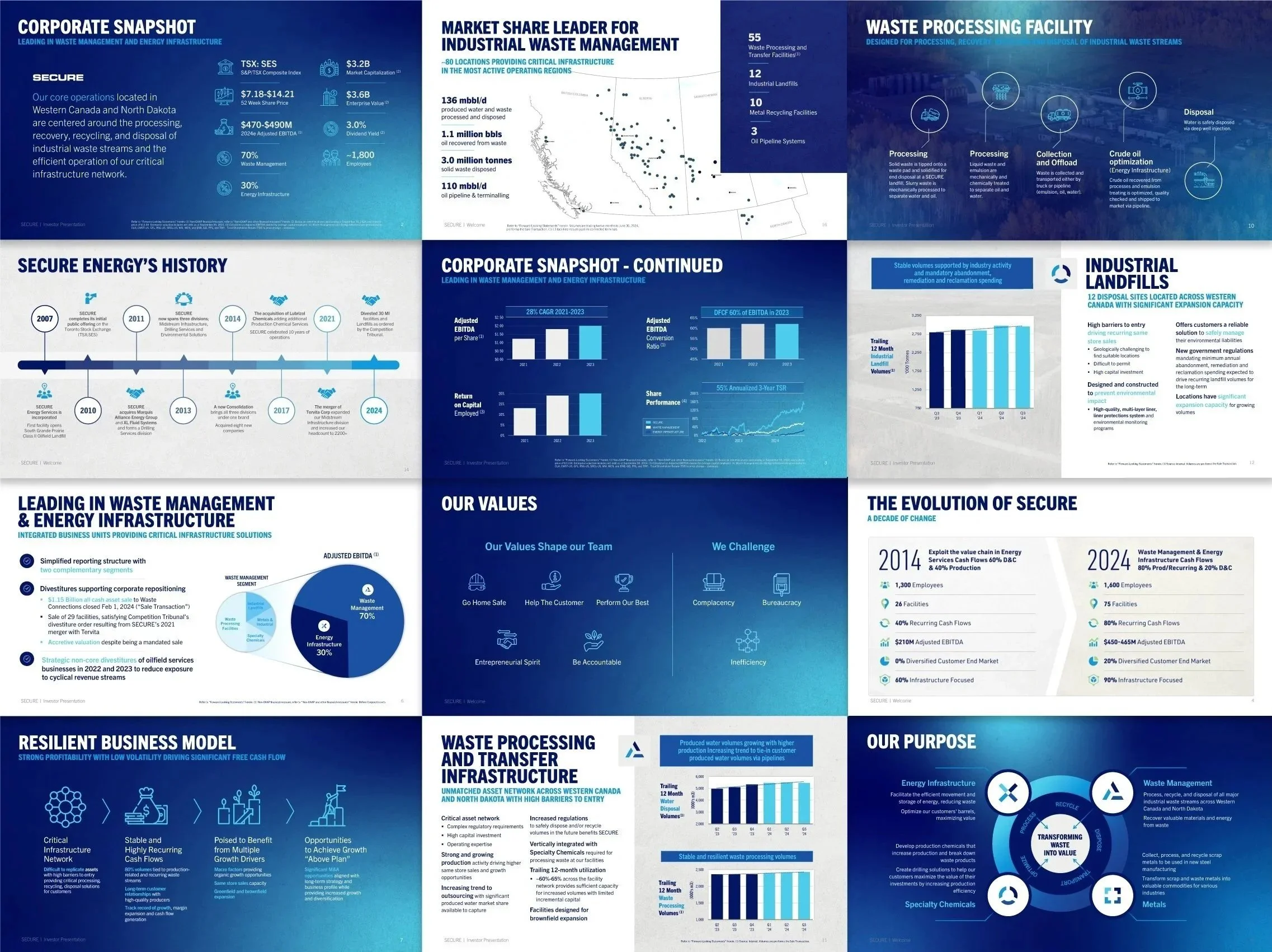 SECURE is a North American leader in waste management and energy infrastructure focused on delivering midstream environmental solutions. Following a strategic rebranding, the organization required an evolution of its Investor Relations communications to reflect its solidified market position. My approach utilized the new brand direction to translate complex infrastructure data into a clear, value-focused visual narrative. By prioritizing clean layouts and sophisticated data visualization, the resulting system ensures that SECURE’s commitment to safety and innovation is effectively communicated to the capital markets.